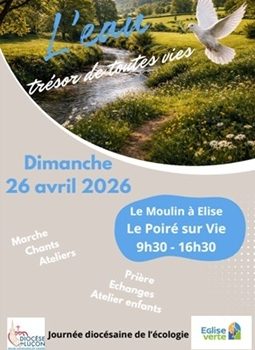Dimanche 26 avril 2026 Le Moulin a Elise – 85170 Le Poiré-sur-Vie Découvrir le flyer Le groupe diocésain de l’écologie propose une journée au bord de l’eau. Avec nos intervenants, en atelier, ce sera l’occasion de louer la Création de façon originale. Ateliers : – Etat des lieux et perspectives…
