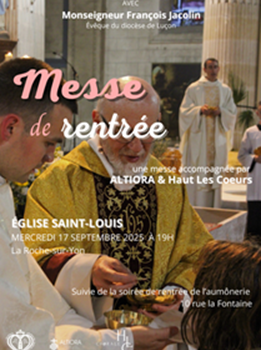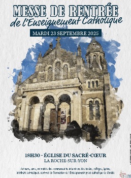 La messe de rentrée de l’Enseignement catholique de Vendée se tiendra le mardi 23 septembre à 18h30 à l’église du Sacré-Cœur à La Roche-sur-Yon. Elle est ouverte à tous : élèves, parents, enseignants, personnels, étudiants à l’ICES ou en centres de formation, retraités des communautés éducatives… Venez nombreux ! Affiche…